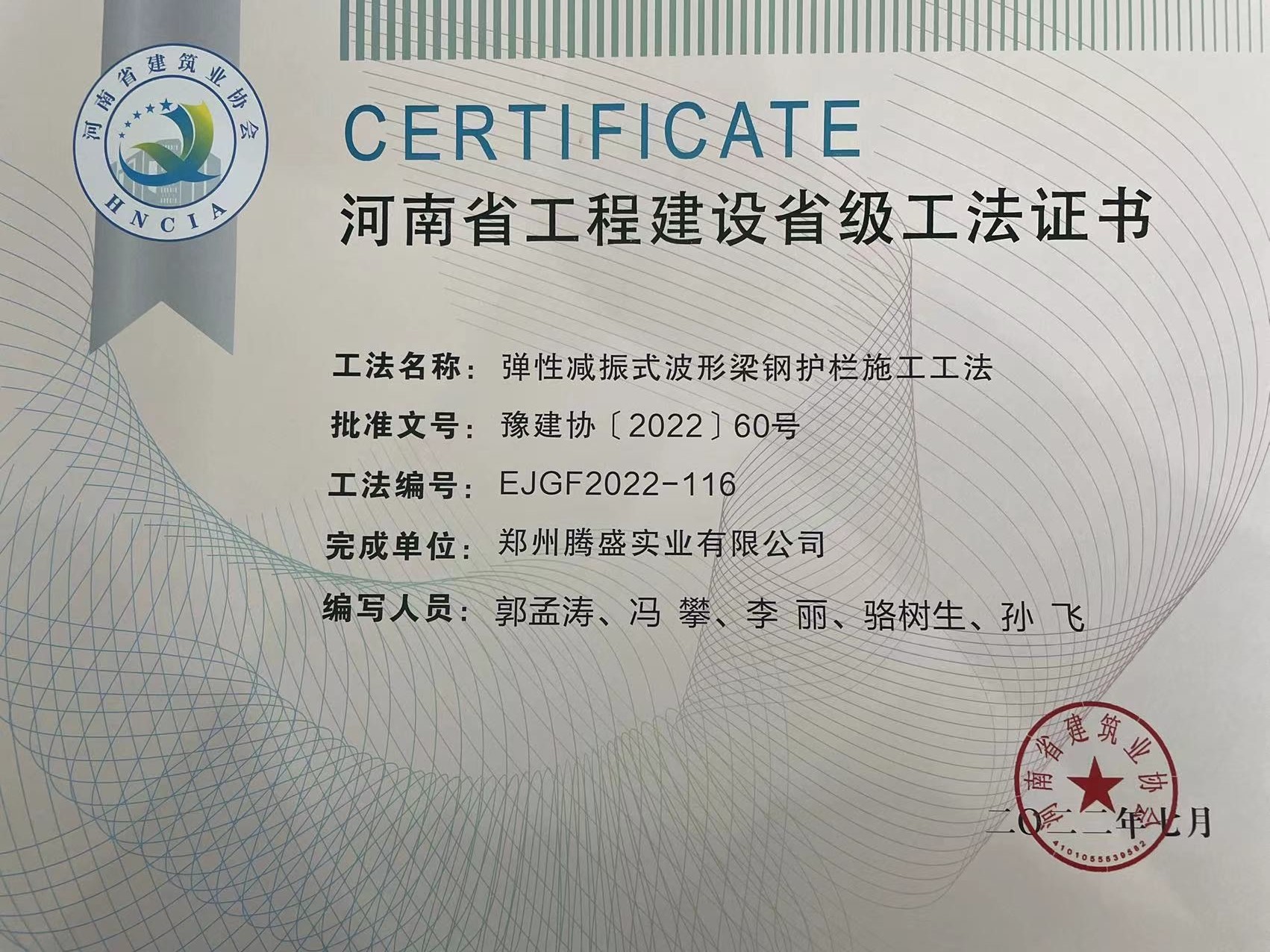 近日,我公司關(guān)于“彈性減震式波形梁鋼護(hù)欄施工工法”順利通過(guò)河南省建筑業(yè)協(xié)會(huì)批準(zhǔn),取得相應(yīng)省級(jí)工法證書(shū),該工藝的順利批準(zhǔn),標(biāo)志著我公司在波形梁鋼...