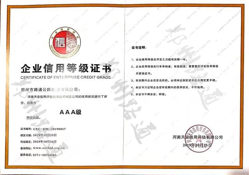 同時(shí)河南鑫誠(chéng)信用管理咨詢有限公司評(píng)審的省級(jí)企業(yè)信用等級(jí),路通公司也通過(guò)了AAA等級(jí)。