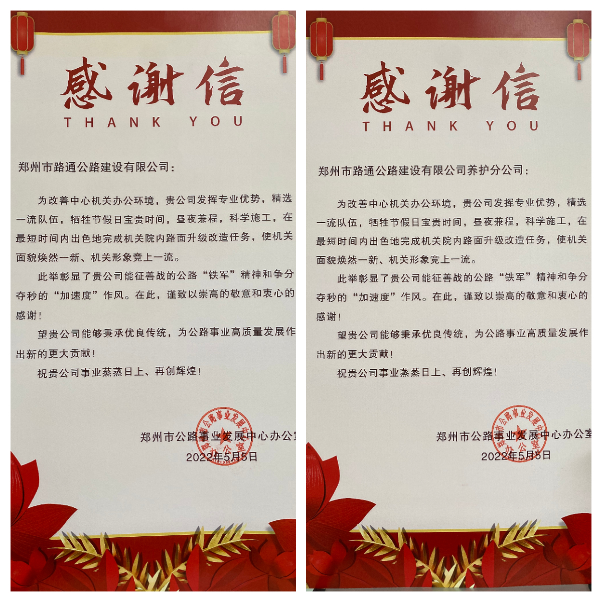 近日,我公司收到了兩封特殊的感謝信,均來(lái)自鄭州市公路事業(yè)發(fā)展中心,這不由讓每一位路通干部職工倍感欣慰。來(lái)信對(duì)路通公司、路通養(yǎng)護(hù)分公司圓滿完成鄭州市公路事業(yè)發(fā)展中心機(jī)關(guān)院內(nèi)路面升級(jí)改造工作致以由衷的感謝。