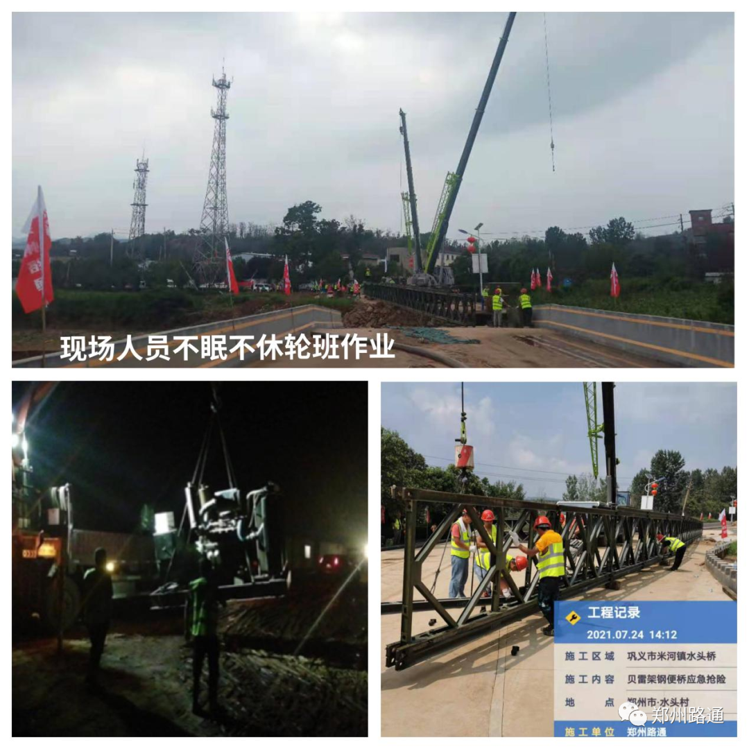 7月22日晚,路通公司緊急調(diào)派40余人及10余臺施工機械進駐鞏義市米河鎮(zhèn)展開救援,班子成員親臨現(xiàn)場研究搶險方案,施工人員不眠不休、輪班作業(yè)。為加快施工進度,24日凌晨3點,所有現(xiàn)場人員全體參與鋼架橋配件的卸車工作,當(dāng)前米河鎮(zhèn)水頭村水頭橋鋼便橋已拼裝完畢,計劃連夜完成安裝任務(wù),確保25日早橋上順利通車。