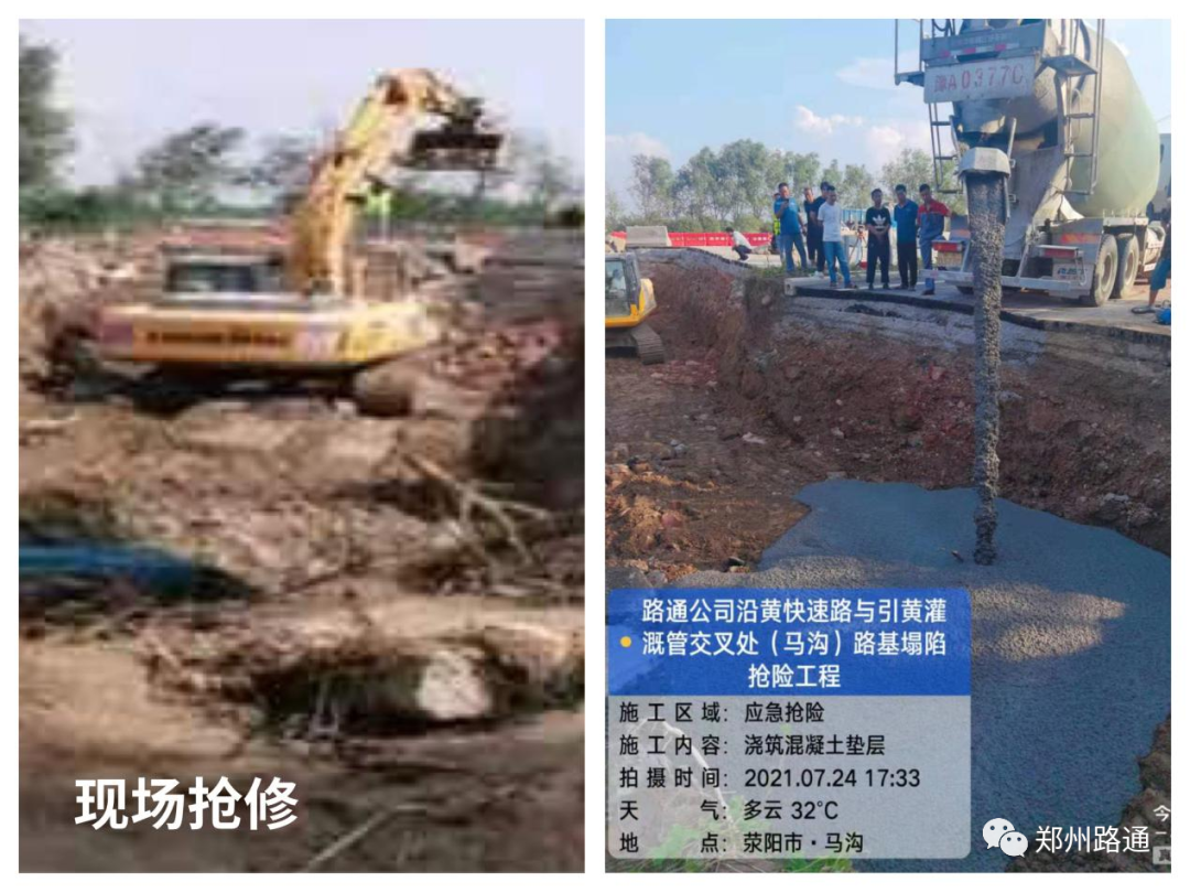 7月23日中午,路通公司接到指令,地處滎陽的S312沿黃快速路與鄭焦高速互通立交西側(cè)匝道及沿黃快速路與其相連主體出現(xiàn)路基空洞,東西雙向完全斷行,要求搶修。路通公司下午即刻派駐18人,出動六臺施工機械進駐現(xiàn)場進行搶修。截止7月24日下午,北半幅溝槽開挖完成,正在進行管道基礎(chǔ)施工;南半幅臨時回填完成,已開放半幅雙向分流通行。