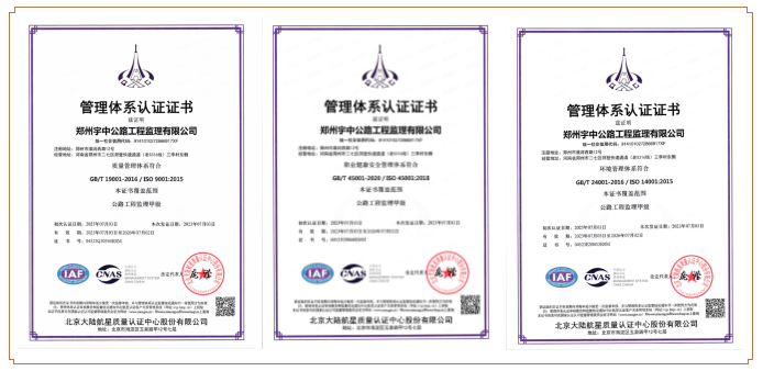 近日,鄭州宇中公路工程監(jiān)理有限公司順利通過ISO9001質(zhì)量管理體系、ISO14001環(huán)境管理體系及ISO45001職業(yè)健康安全管理體系認(rèn)證并取得認(rèn)證證書。
