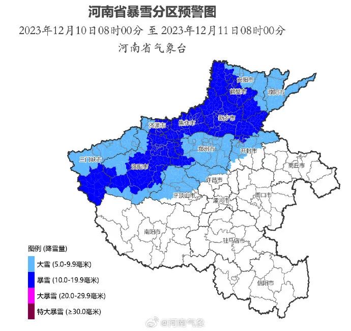 河南省氣象臺(tái)2023年12月9日16時(shí)發(fā)布暴雪黃色預(yù)警:預(yù)計(jì)10日08時(shí)到11日08時(shí),黃河以北和三門峽、洛陽(yáng)、鄭州、開(kāi)封北部、許昌北部、平頂山北部部分縣市將出現(xiàn)5毫米以上的降雪。請(qǐng)注意防范。