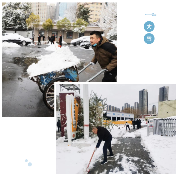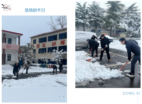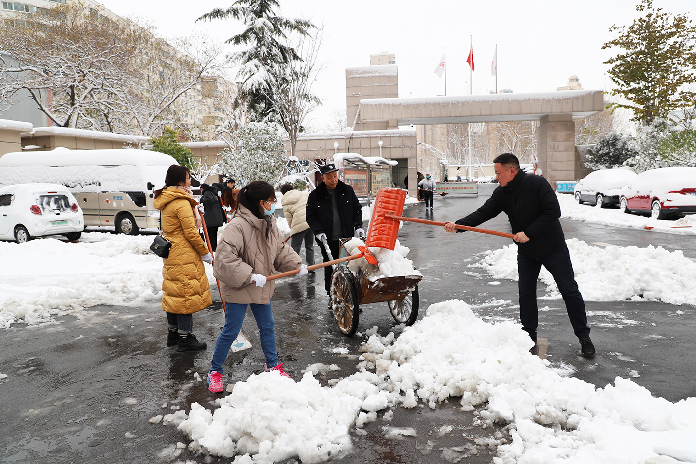 清雪現(xiàn)場,大家不畏嚴寒,攜帶鐵鍬、掃把、冰鏟等工具對院區(qū)和門口的積雪進行清理。鏟雪、搬運、清掃分工明確、默契配合,在寒冷的天氣中表現(xiàn)出了極大的熱情與責(zé)任感。