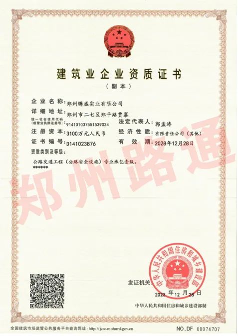 近日,騰盛公司成功完成公路交通工程(公路安全設(shè)施)專業(yè)承包一級資質(zhì)的延續(xù)工作,獲得由住建部頒發(fā)的壹級資質(zhì)證書。
